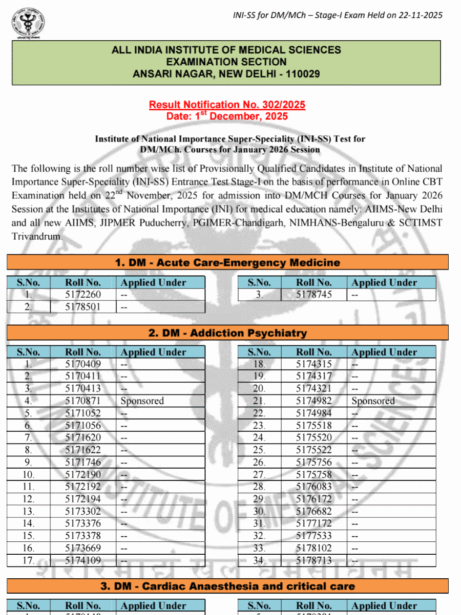 Candidates who appeared for the examination can now check their results online. The ini ss result nov 2025 is available in a roll number-wise PDF format containing the list of qualified candidates for the January 2026 academic session.