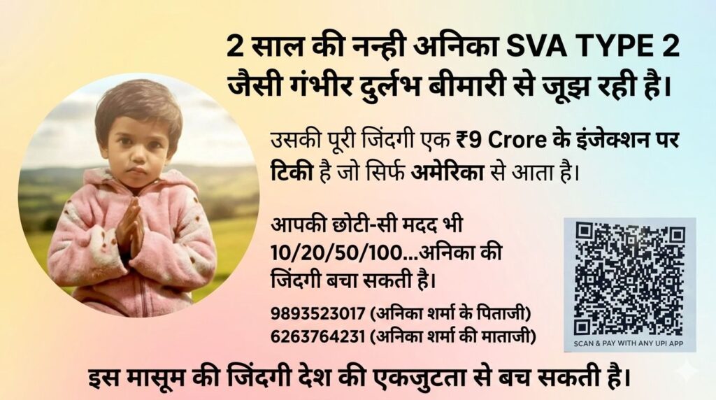 अनिका एक दुर्लभ और जानलेवा बीमारी – Spinal Muscular Atrophy (SMA) से पीड़ित है। यह बीमारी धीरे-धीरे बच्चे की मांसपेशियों को कमजोर कर देती है।