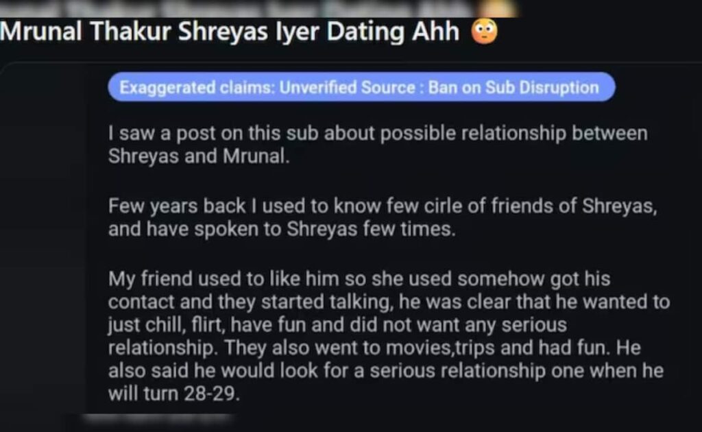 पिछले कुछ दिनों में Reddit और X जैसे प्लेटफॉर्म पर एक दावा वायरल हुआ कि मृणाल ठाकुर और क्रिकेटर श्रेयस अय्यर पिछले कुछ महीनों से एक-दूसरे को चुपचाप डेट कर रहे हैं। कहा गया कि दोनों अपनी मुलाकातों को मीडिया की नज़रों से दूर रखते हैं, ताकि अनावश्यक चर्चा न हो। इन अनवेरिफाइड पोस्ट्स को कई फैन पेजों ने उठाया और देखते ही देखते यह कहानी सोशल मीडिया पर फैल गई। हालांकि मृणाल के नए वीडियो ने साफ कर दिया कि वह इन कहानियों को गंभीरता से नहीं ले रहीं और शायद इनमें कोई सच्चाई भी नहीं है।